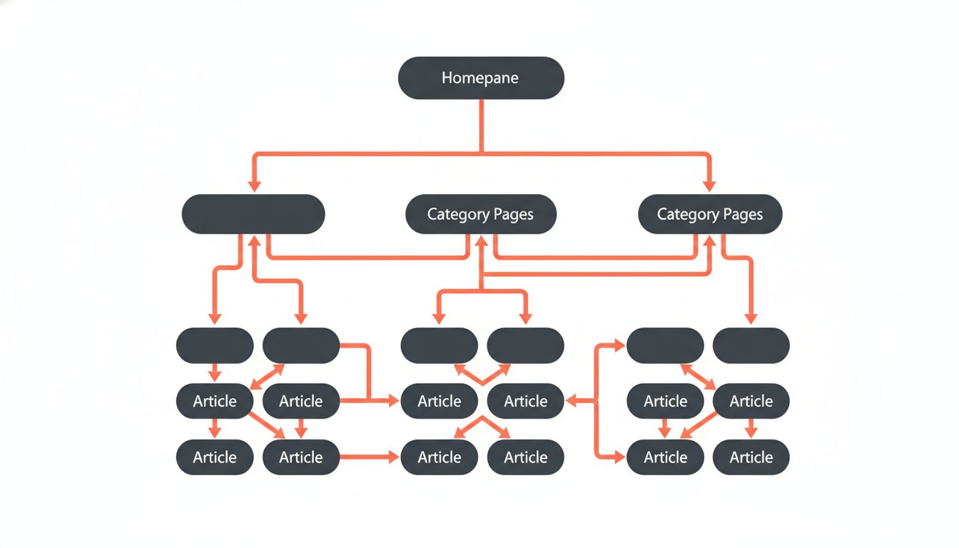 Schéma d’un maillage interne structuré : la page d’accueil distribue l’autorité aux catégories puis aux articles satellites.